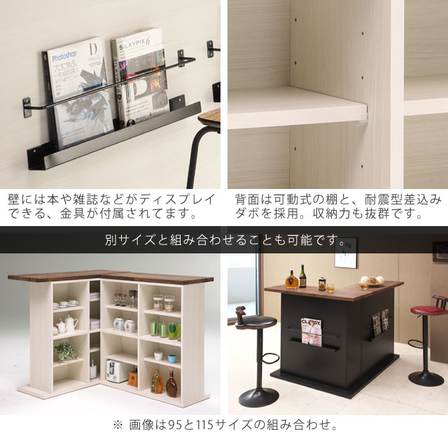 ■商品サイズ 幅170×奥行43×高さ104cm 重量:約50kg ■材質 天板:MDF木目調強化シート ■商品詳細 日本製 完成品(棚板のみお客様取り付け) 可動式棚板 耐震型差し込みダボ ■スタッフレビュー ○… おしゃれなBARタイムを満喫できるカウンターテーブル 木目の天板の風合いをブックラックの機能や天板と異なる色合いを採用することでモダンなテイストの演出を実現します。