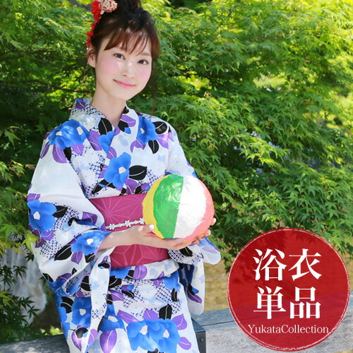 【最大1000円OFFクーポン】浴衣 単品 レディース 高級変わり織り綿浴衣単品「白地に青の椿と紫の葉」 浴衣 白地 椿 青 古典柄